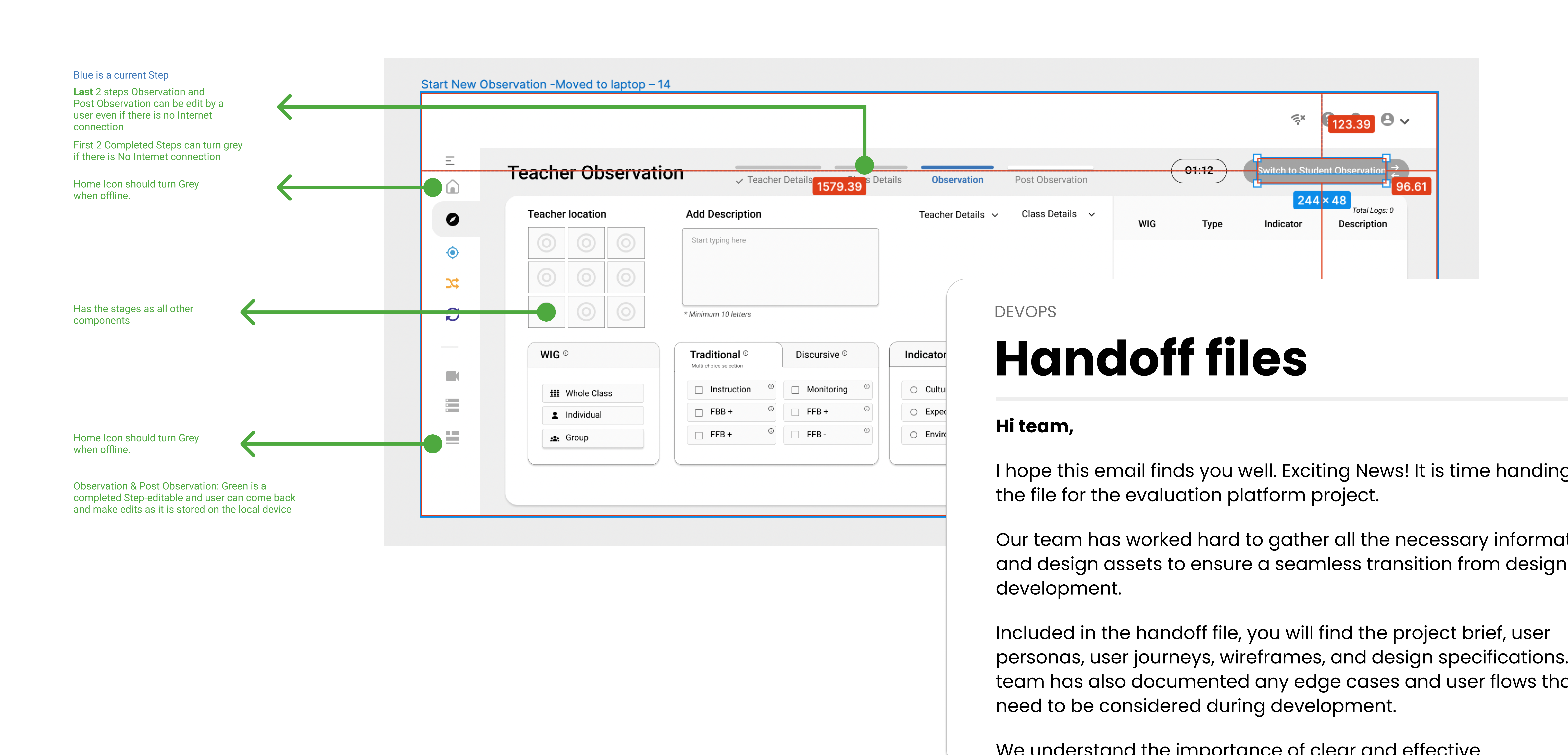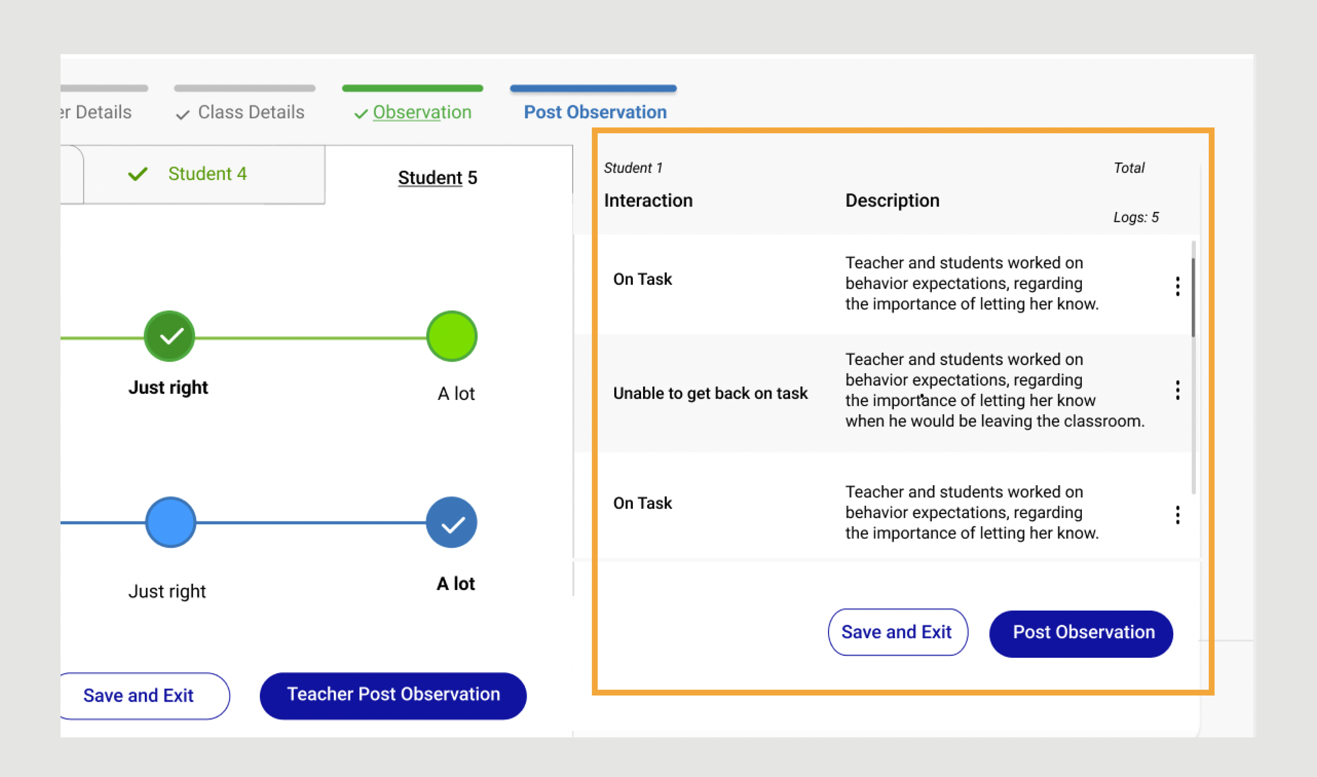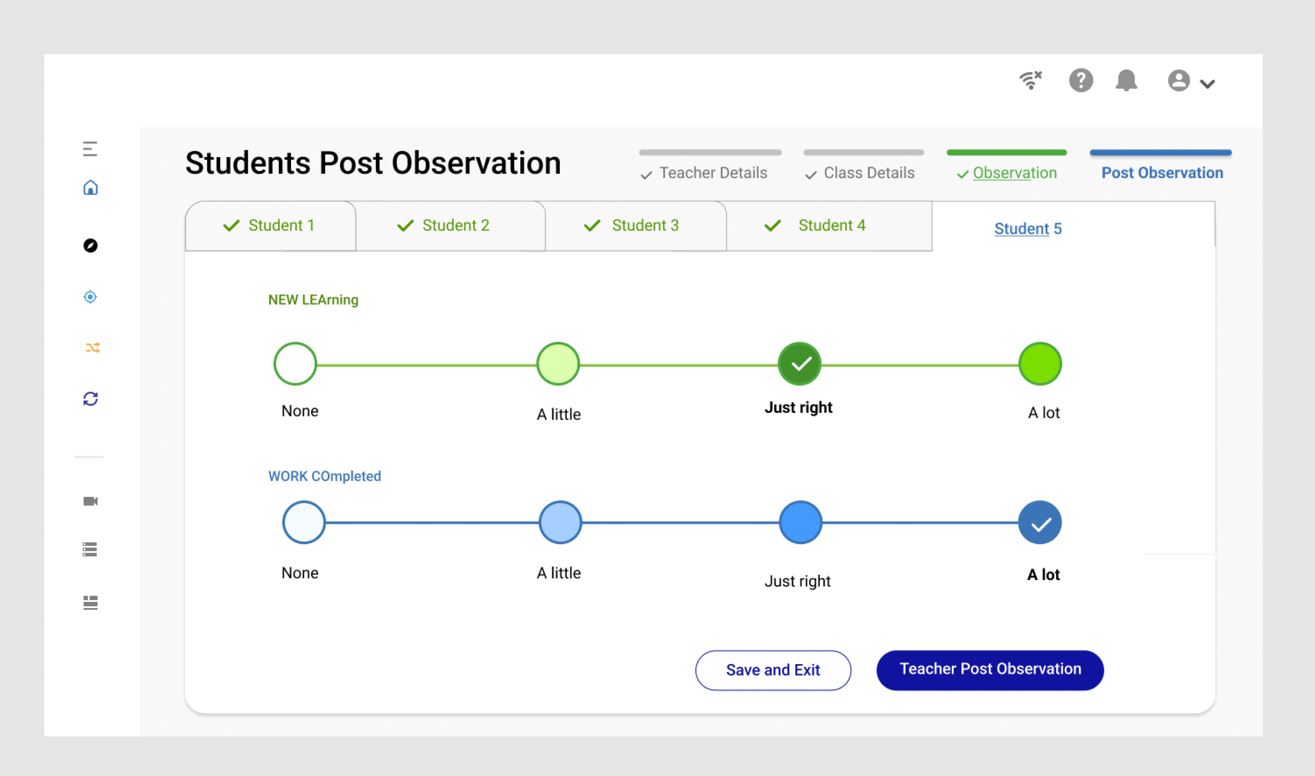 Time on Task: This KPI was one of the important ones- as Observation has a timer. We tasked users to "Complete 2steps of the Observation: Teacher and Class Details". 8 Participants. Time on Task in seconds: 22, 15, 60, 24, 18, 31, 17, 45 (22+15+60+24+18+31+17+45)/7= 29. Result shows that it took 29 seconds on average to complete first 2 steps of the Observation. Which is 47 second faster than old one.