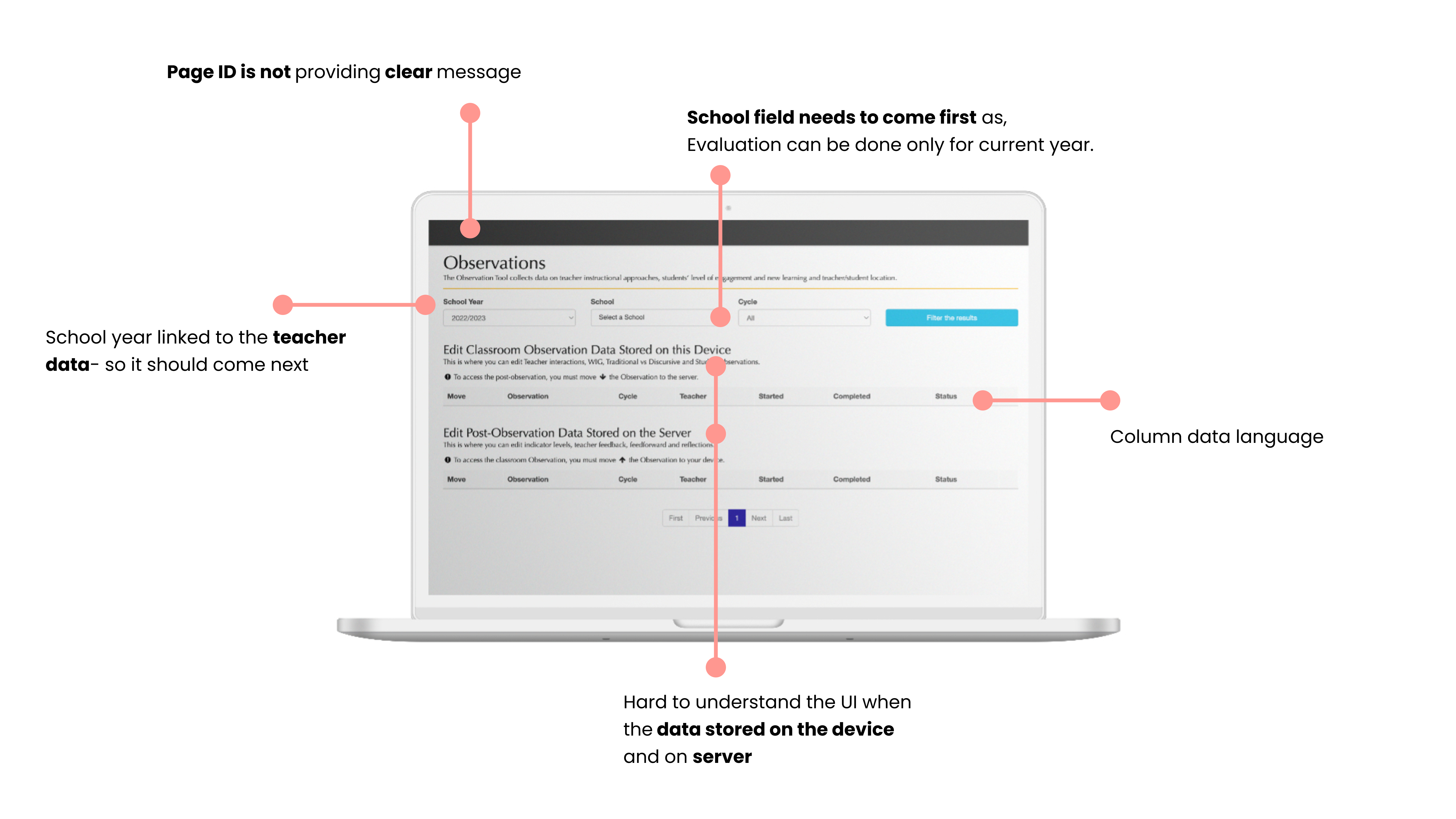 The Teacher Evaluation Platform enables Observers to assess the performance of public school teachers and students on a bi-annual basis. This platform not only facilitates observations, but also allows school-based facilitators to set objectives after the observation, track progress, conduct surveys, and reflect on the year's outcome.