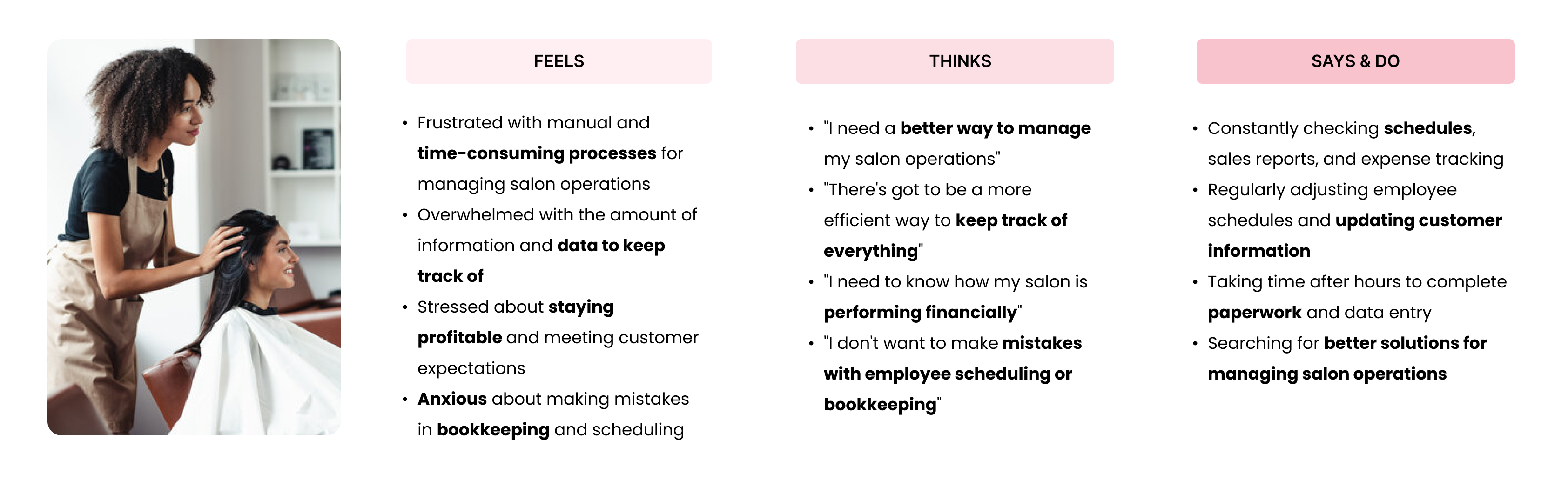 Needs: Mobile Application user, Jason is tech-savvy and is comfortable using software solutions, but he wants a solution that is user-friendly and designed specifically for hair salon professionals.