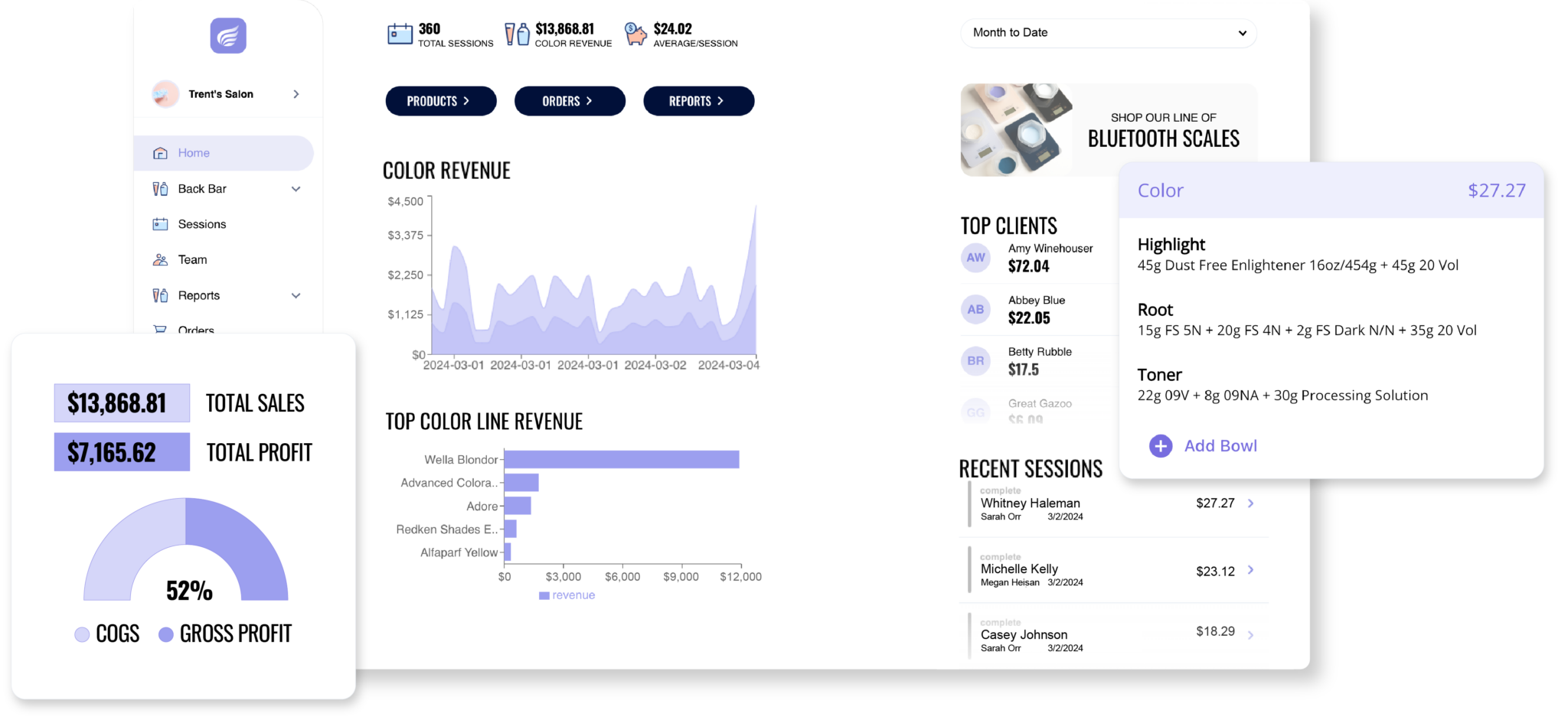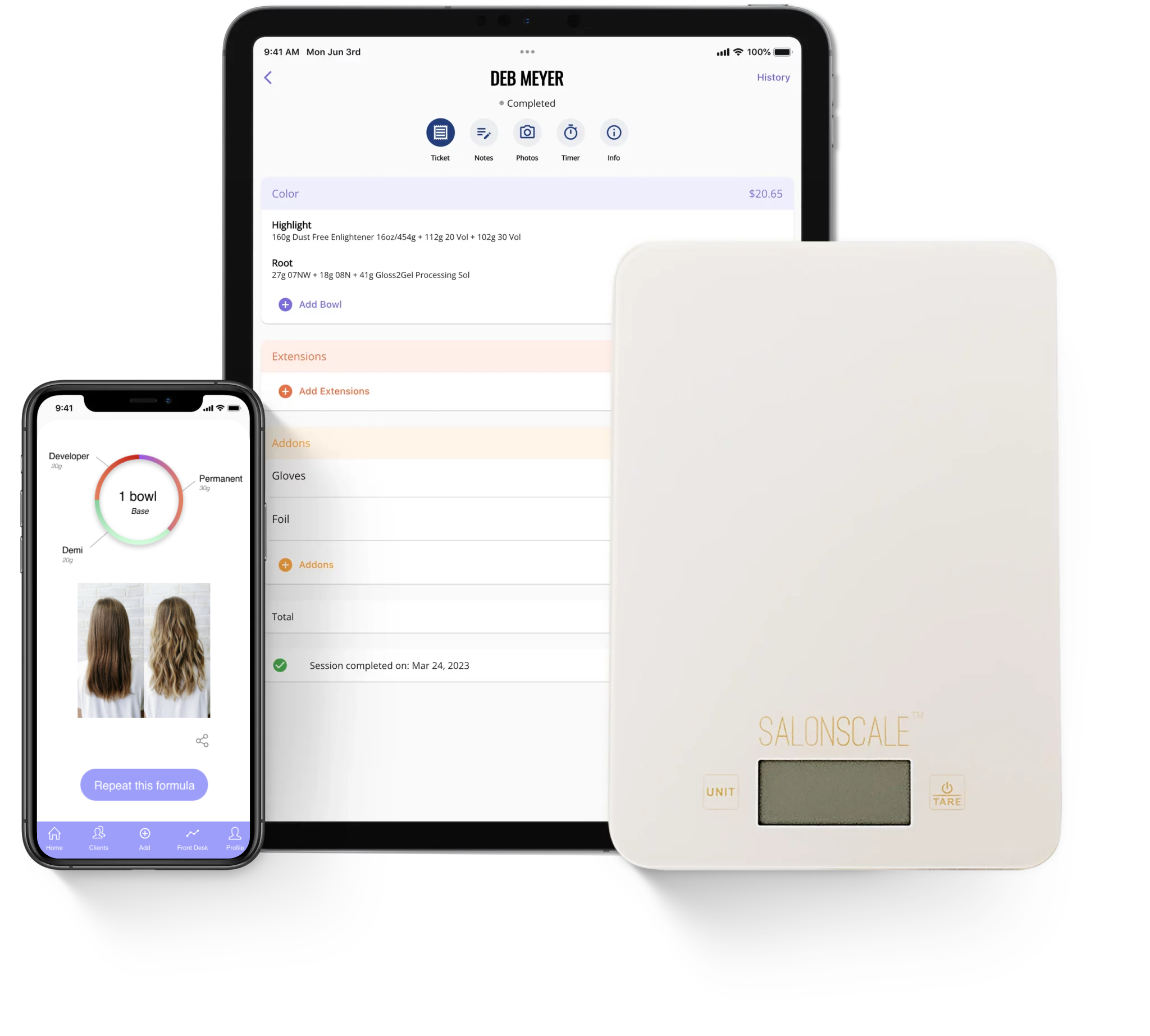 Go paperless with SalonScale and connect to the Bluetooth Scale, and Create a product data base with prices and set a Formula to calculate the colors was weight This solution that allows you to track your color recipe, store client information in one central location, and get an accurate price for the colors used. Additionally, if we design the back bar inventory feature, stylist can easily manage the inventory and ensure that they always have the products they need.